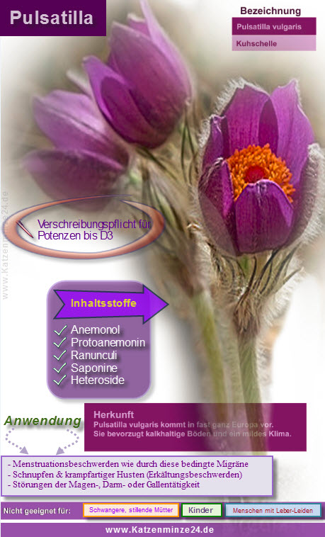 Pulsatilla vulgaris – Vorkommen & Herkunft Der natürliche Lebensraum der Pulsatilla vulgaris erstreckt sich über ganz Europa. Diese Heilpflanze ist auch unter den Namen Kuhschelle oder Küchenschelle zu finden. Die Pulsatille vulgaris fühlt sich in lichten Kiefernwäldern und Magerrasen besonders wohl. Sie bevorzugt ein mildes Klima und kalkhaltige Böden in sonniger Hanglage. Die Pulsatille liebt